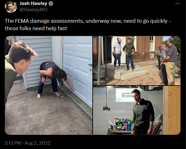 Hawley recognizes the value that FEMA provides to the U.S., as he co-sponsored the bipartisan Federal Disaster Response Act in 2020 to remove the one-year FEMA worker deployment cap. He also tweeted about the importance of a strong response to disasters by FEMA following flooding in Missouri in 2022.