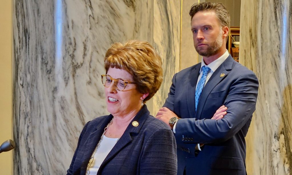 Senate Majority Leader Cindy O’Laughlin of Shelbina speaks after passage of a $51.7 billion state budget as Sen. Lincoln Hough of Springfield waits for his turn to speak. Photo by Rudi Keller/Missouri Independent.