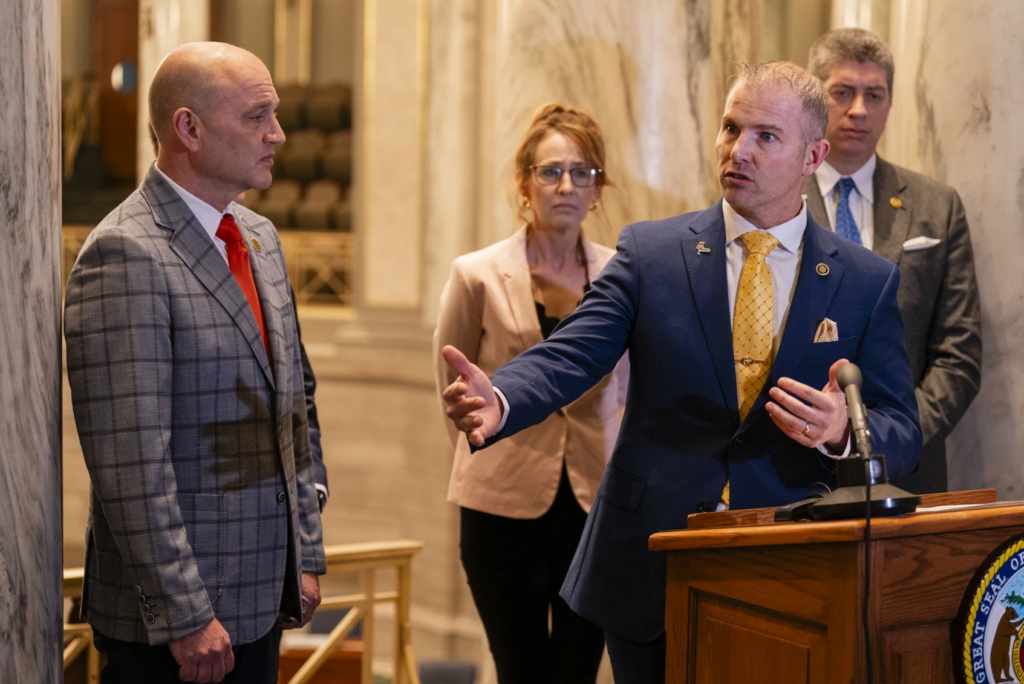Missouri State Sen. Rick Brattin, R-Harrisonville, speaks during a press conference in January. Sen. Denny Hoskins, R-Warrensburg, stands to his left. The pair, along with Sen. Nick Schroer, R-St. Charles County, are being sued for defamation. Photo by Eric Lee/STLPR.