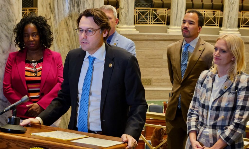 Senate Minority Leader John Rizzo, center, speaks to reporters after the Senate approved a budget. With Rizzo are, from left, Sens. Karla May, Doug Beck of Affton, Steven Roberts of St. Louis and Lauren Arthur of Kansas City. Photo by Rudi Keller/Missouri Independent.